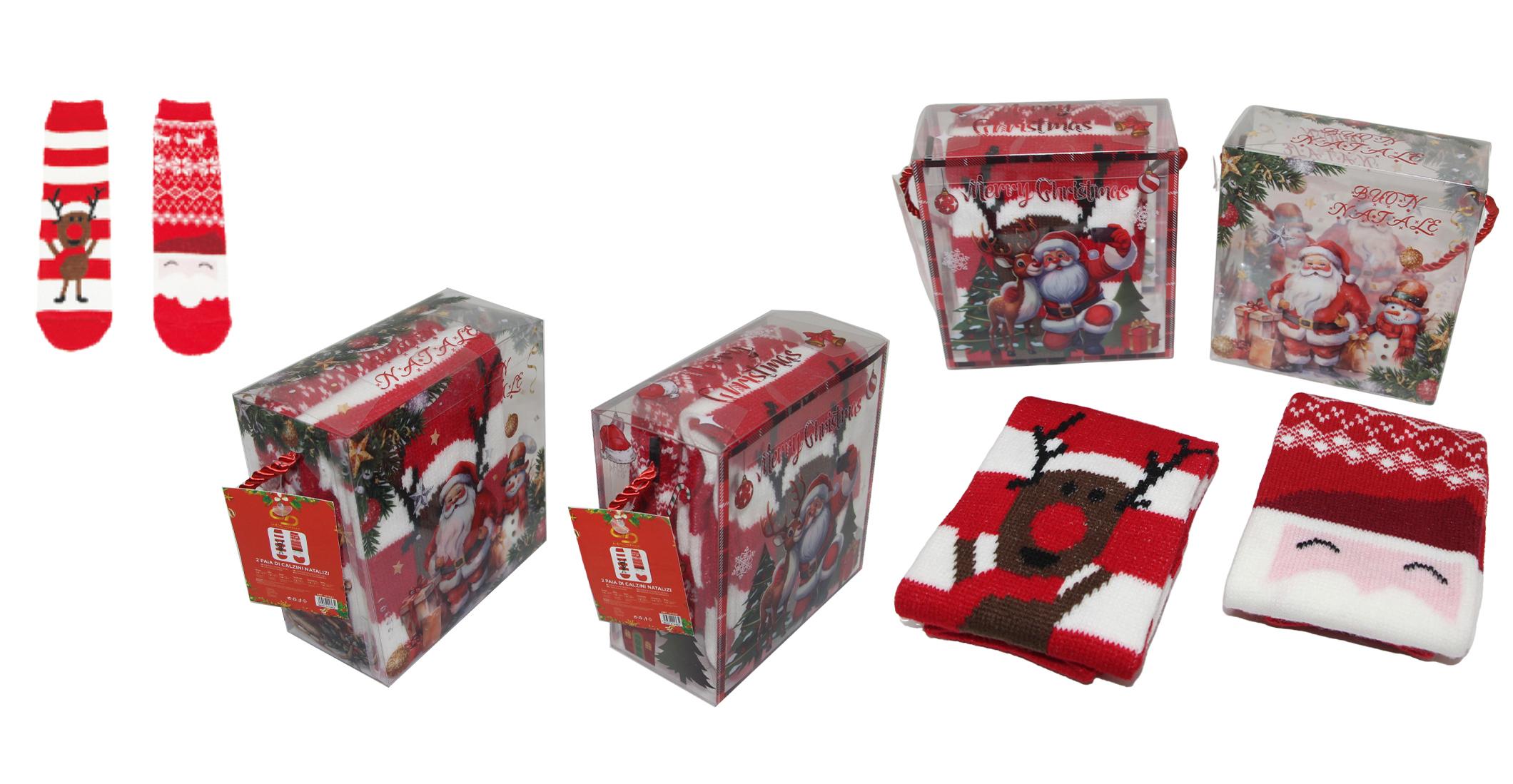 GD LOVES XMAS Set Regalo 2 Calzini Lunghi Natalizi in Scatola Decorata | Morbidi e Caldi in Maglia – Fantasie Natalizie Babbo Natale & Renna